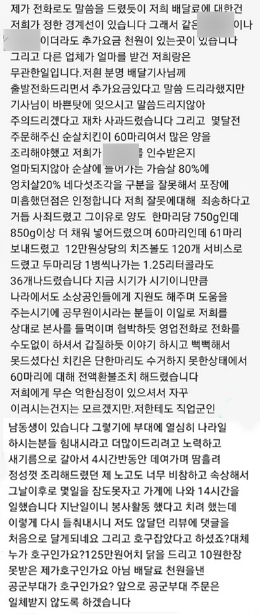 업주는 “몇달 전 주문한 순살치킨 60마리는 많은 양을 조리해야 했고, 인수한 지 얼마 안 돼 순살에 들어가는 가슴살과 엉치살 네다섯 조각 구분을 잘못해 포장에 미흡했던 점은 인정한다”면서도 “죄송하다고 거듭 사과드렸고, 양도 1마리당 750g인데 850g 이상 채워넣었다”고 반박했다.