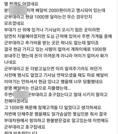 수도권의 한 프랜차이즈 치킨가게의 배달앱에 올라온 한 리뷰를 캡처한 게시물로, 별점 1점을 준 이용자는 “지역 배달비 2000원이라고 명시돼 있는데 군부대라고 현금 1000원을 더 달라고 했다”면서 “계좌이체로 1000원을 보내긴 했는데 어이가 없어서 화가 난다”고 썼다.